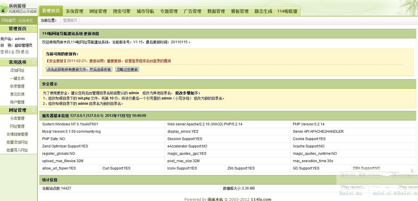 114导航系统官方版,应站长朋友要求修改天气预报插件不兼容问题。在后台顶部广告位置换成天气预报代码【效果请看截图】,并可更换多种皮肤风格,全后台操作安装方法1.加压后,上传upload目录下所有文件到网站根目录2.需要数据库3.网站页面全后台操控,方便简单。可生成静态页面。4.请自己修改源码中的广告,广告在后台修改5.后台顶部广告代码换成一下代码声明:本源码只限用于研究学习之用。